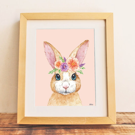 Flower Crown Bunny Illustration Print - Peach/Orange